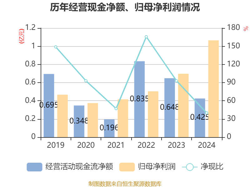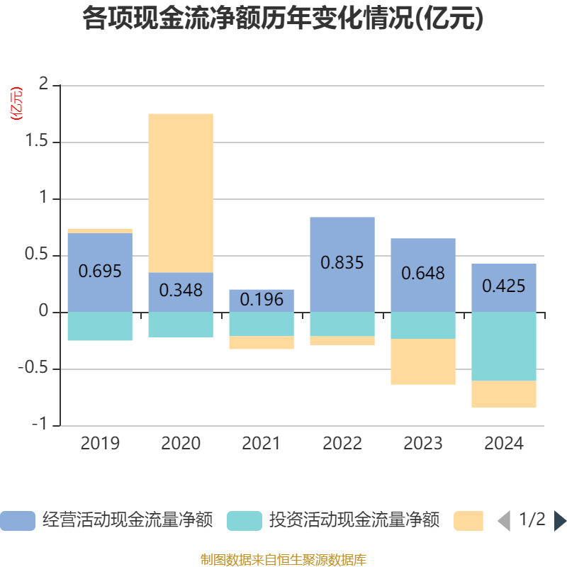 截至2024年,公司经营活动现金流净额为4251.36万元,同比下降34.34%;筹资活动现金流净额-2353.86万元,同比增加1689.31万元;投资活动现金流净额-6093万元,上年同期为-2383.92万元。