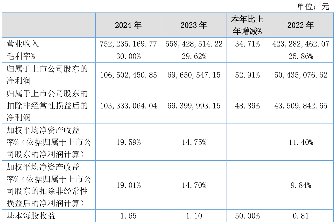 中证智能财讯建邦科技(837242)4月24日披露2024年年度报告。2024年,公司实现营业总收入7.52亿元,同比增长34.71%;归母净利润1.07亿元,同比增长52.91%;扣非净利润1.03亿元,同比增长48.89%;经营活动产生的现金流量净额为4251.36万元,同比下降34.34%;报告期内,建邦科技基本每股收益为1.65元,加权平均净资产收益率为19.59%。公司2024年度分配预案为:拟向全体股东每10股派现2元(含税)。