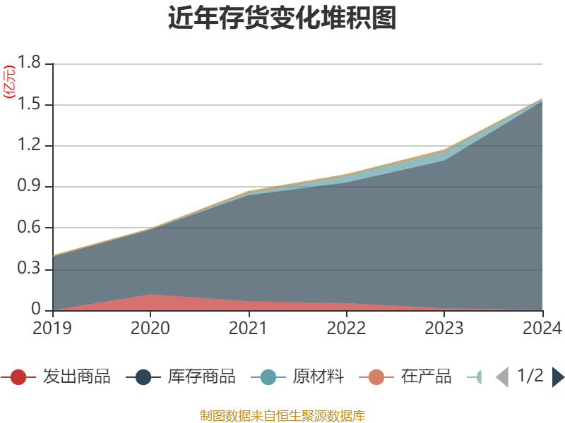 从存货变动来看,截至2024年末,公司存货账面价值为1.55亿元,占净资产的25.63%,较上年末增加3740.09万元。其中,存货跌价准备为39.33万元,计提比例为0.25%。