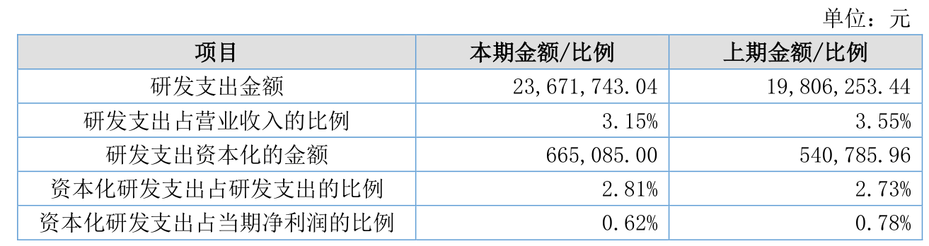 2024年全年,公司研发投入金额为2367.17万元,同比增长19.52%;研发投入占营业收入比例为3.15%,相比上年同期下降0.4个百分点。此外,公司全年研发投入资本化率为2.81%。