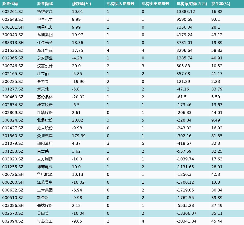 南财智讯4月25日电,南财金融终端数据显示,因当日异动登上龙虎榜的个股中辽宁配资平台叫什么名字,28只沪深A股龙虎榜出现了机构的身影,机构合计净卖出5468.95万元,具体来看,机构净买入10只个股,净卖出18只个股。其中,机构净买入前三分别为拓维信息(002261.SZ)、卫星化学(002648.SZ)与明星电力(600101.SH),详情见下图:机构净卖出的个股中,前三分别为青岛金王(002094.SZ)、贝因美(002570.SZ)与先达股份(603086.SH)。